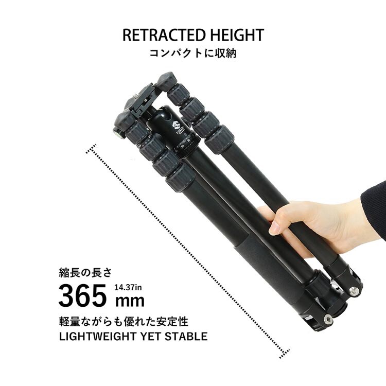 ●「TA225CJ+BA25J カーボン5段トラベル三脚雲台セット」は、旅行好きや写真愛好家に最適な高性能の三脚です。軽量ながらも堅牢なカーボン素材を使用し、収納時は脚を反転してコンパクトに収納可能。