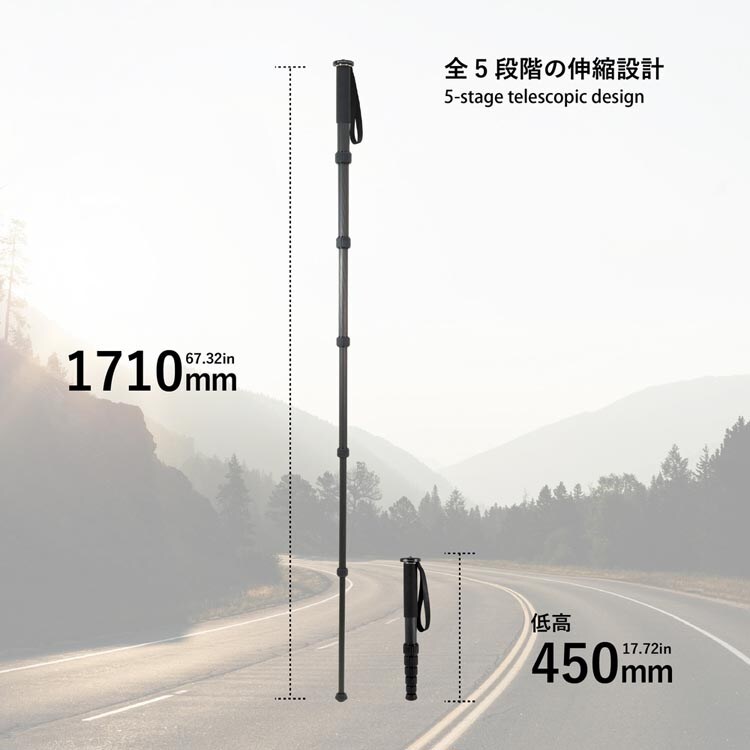 | 素材:カーボン 段数:5 sections パイプ径大:36mm パイプ径小:22mm 最全高:1710mm 縮長:450mm 重量:0.57kg 耐荷重:12kg 雲台取付ベース径:55mm |