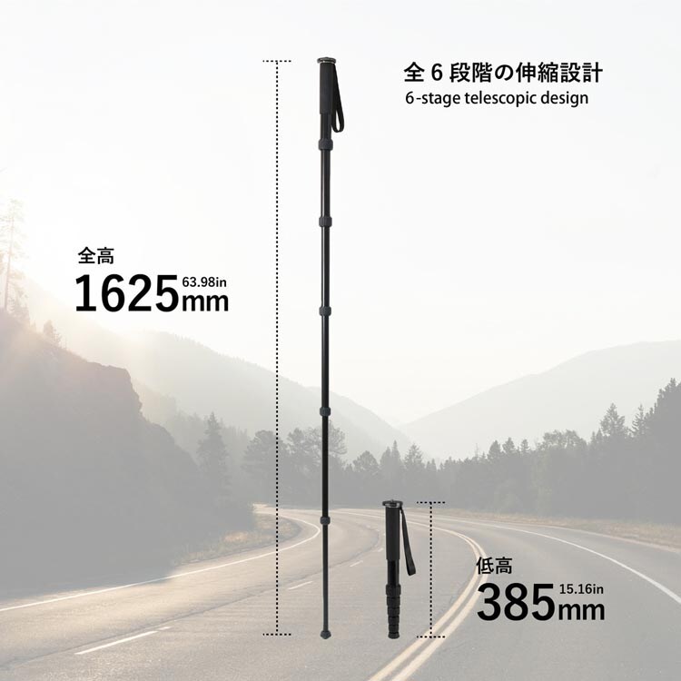 | 素材:アルミニウム 段数:6 sections パイプ径大:32mm パイプ径小:16mm 最全高:1625mm 縮長:385mm 重量:0.59kg 耐荷重:8kg 雲台取付ベース径:55mm |