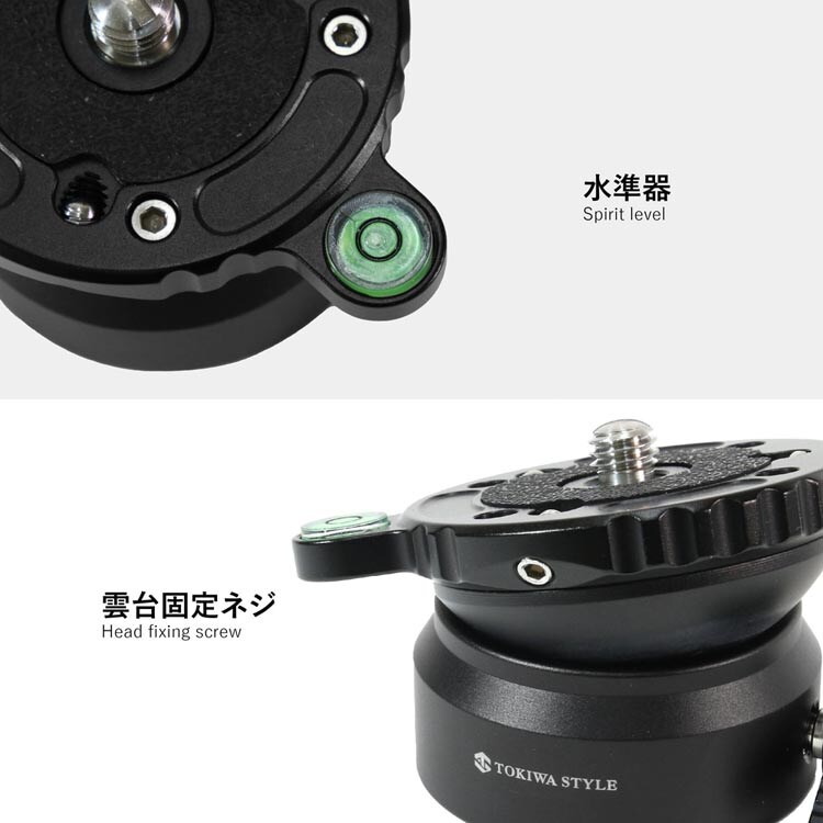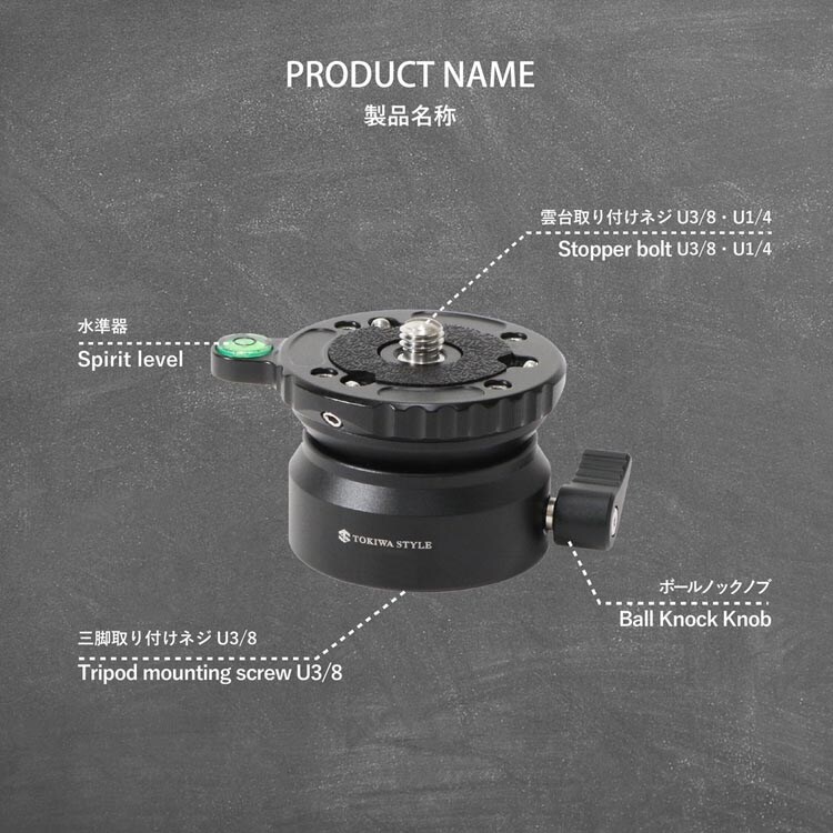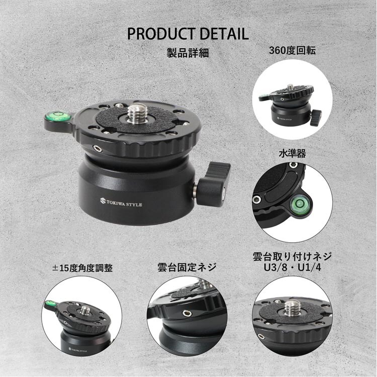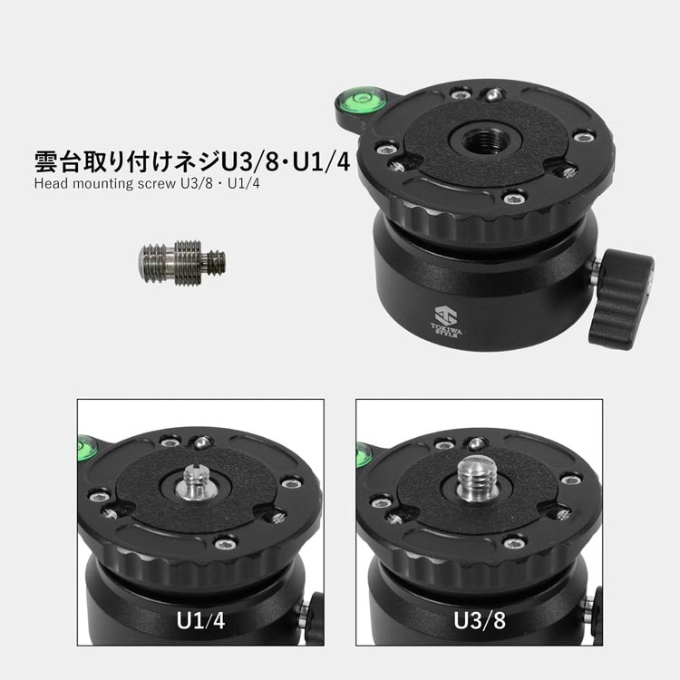 | 素材:アルミニウム 高さ:45mm ベース径:57mm 重量:0.24kg 耐荷重:8kg 三脚取付ネジ穴:U3/8 |