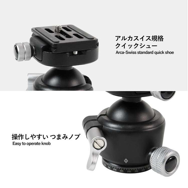 | 素材:アルミニウム ボール径:42mm 高さ:82mm ベース径:44mm 重量:0.31kg 耐荷重:5kg 三脚取付ネジ穴:U3/8 |