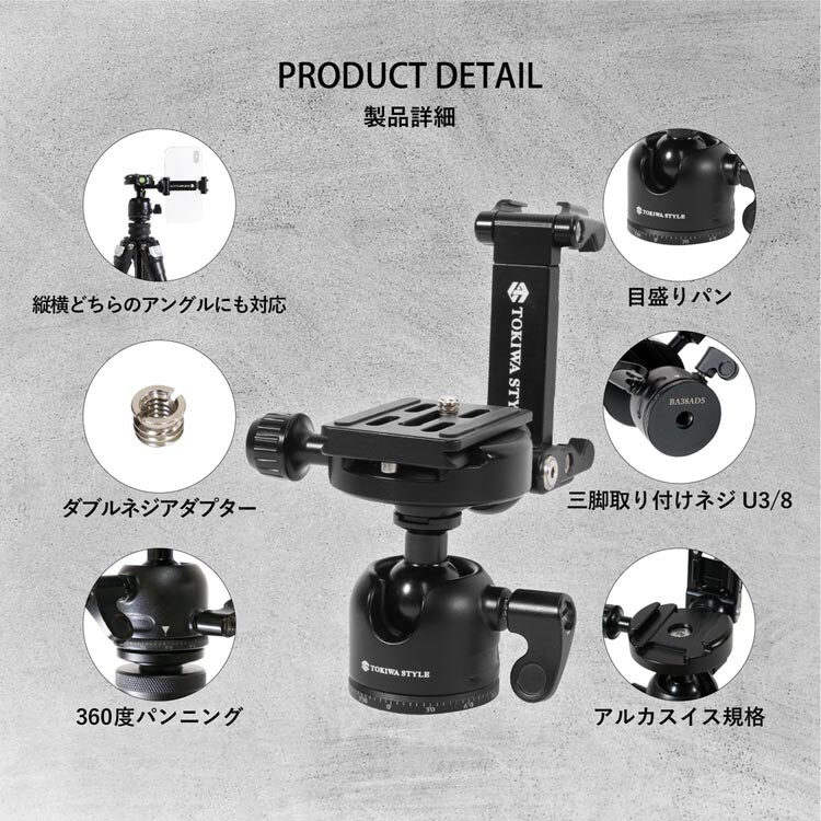 【TOKIWA STYLE 自由雲台 スマホアダプター付 BA38ADSの商品詳細】