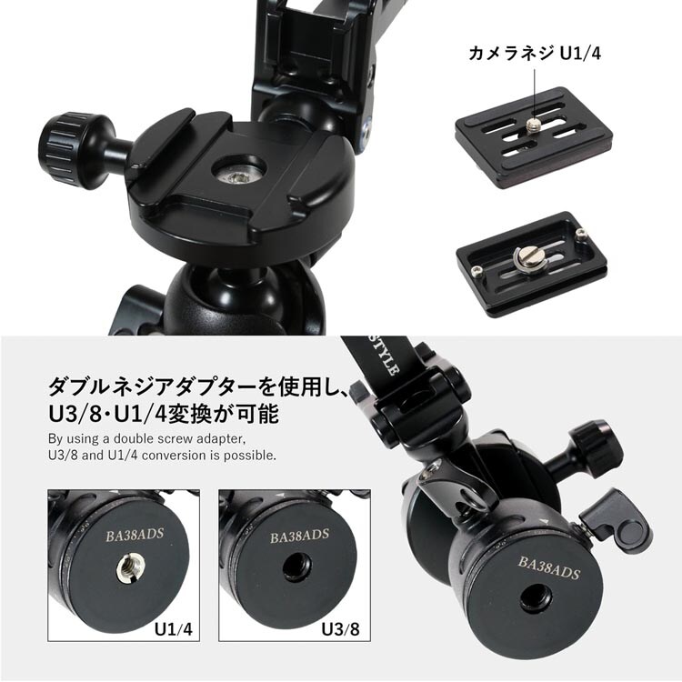 ●「BA38ADS 自由雲台スマホアダプター付」は、スマホとカメラを固定でき、静止画と動画の同時撮影ができます。
