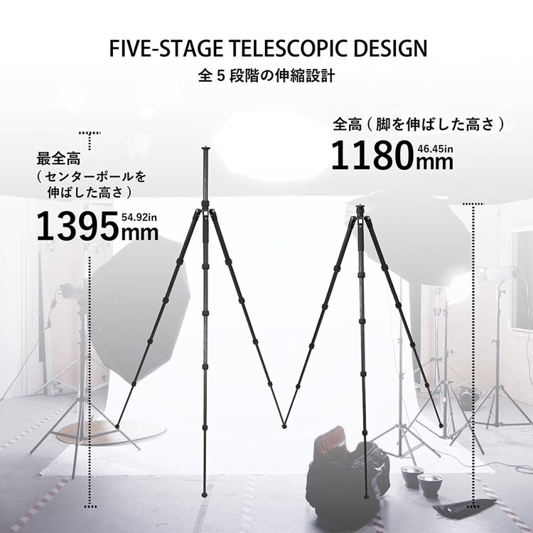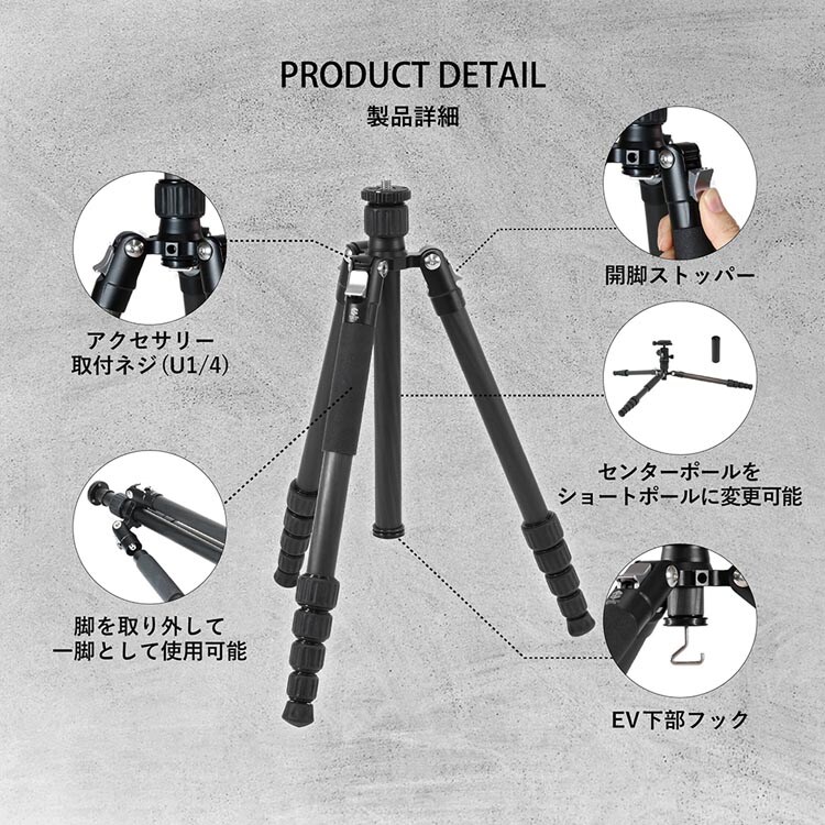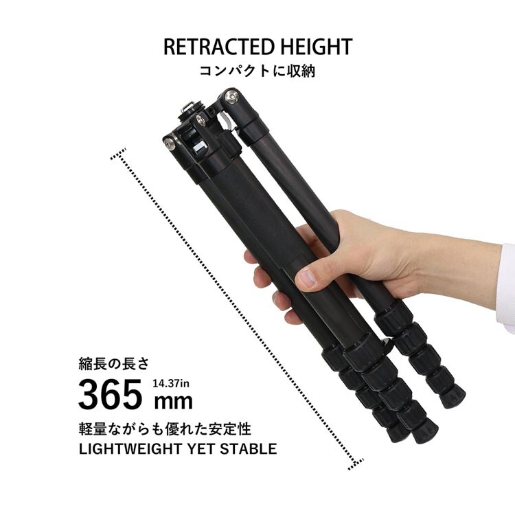 ●軽量ながらも堅牢なカーボン素材を使用し、収納時は脚を反転してコンパクトに収納可能。センターポールを逆さまに付け替えローアングルにも対応。