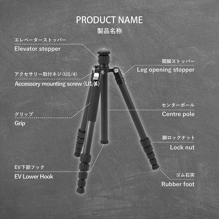 | 素材:カーボン 段数:5sections パイプ径大:22mm パイプ径小:10mm 最全高:1395mm 全高:1180mm 最低高:130mm 縮長:365mm 重量:0.85kg 脚全高:1170mm 脚縮長:325mm 脚重量:0.2kg 雲台取付ベース径:38mm 耐荷重:5kg |