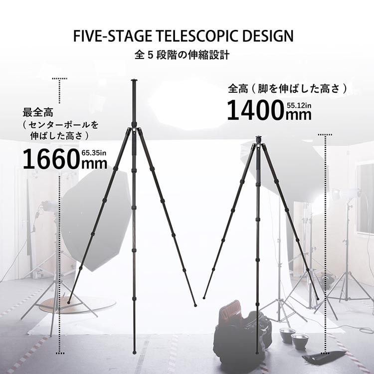 ●全5段階の伸縮設計で、必要に応じた高さ調整がスムーズに行えます。脚を1本取り外して一脚としても使用可能です。