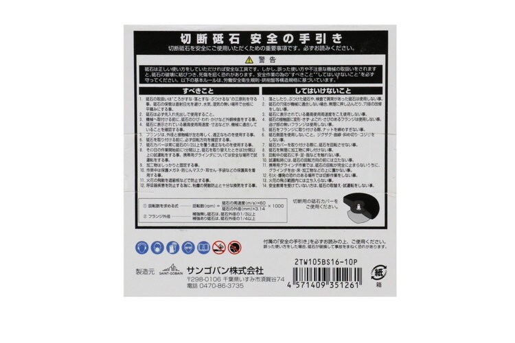 | ・外径:105mm ・厚み:1.6mm ・内径:15mm ・BF41・A60X ・最高使用回転数:14500m/min ・適応機種:100Dディスクグラインダ各種 ・入数:10枚 |