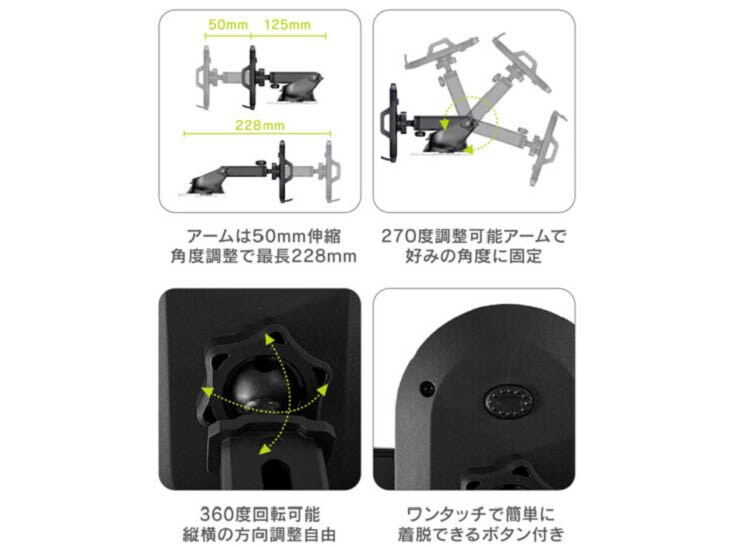 | ホルダーサイズ:約113×67×108mm ホルダー開口幅:約50~100mm アーム調整角度:約270度 アーム伸縮幅:約50mm 本体素材:本体:ABS、吸盤:シリコン 本体重量:約154g |