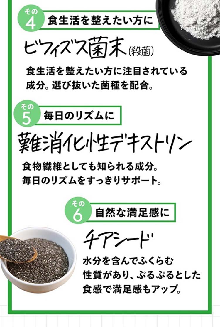 | 水溶性食物繊維、イソマルトオリゴ糖、アロエ濃縮汁、チアシード、アロエベラ液汁末、植物発酵エキス、乳酸菌末(デキストリン、乳酸菌末、乳糖)、ゲル化剤(増粘多糖類)、香料、酸味料、調味料(アミノ酸等)、甘味料(スクラロース、アセスルファムK)、水、消泡剤 |