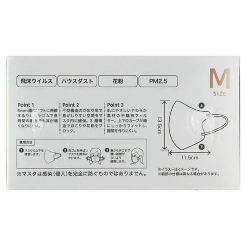 | (素材) 本体・フィルター:ポリオレフィン 耳紐:ポリオレフィン・ポリエステル 包装材:ポリプロピレン(内袋)、紙(外箱) (サイズ)約13.5×11.5cm |