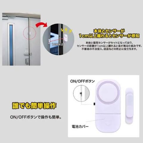 ●設置したドアや窓が開くとセンサーが感知して音を鳴らす、防犯アラーム本体と磁気センサーがセットになっており、センサーの距離が3cm以上離れると音が鳴る仕組みです。