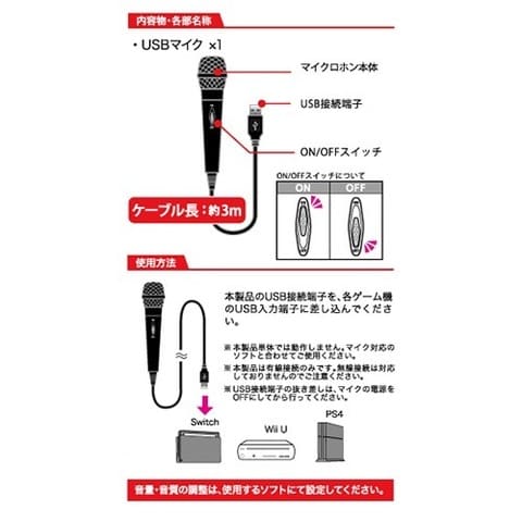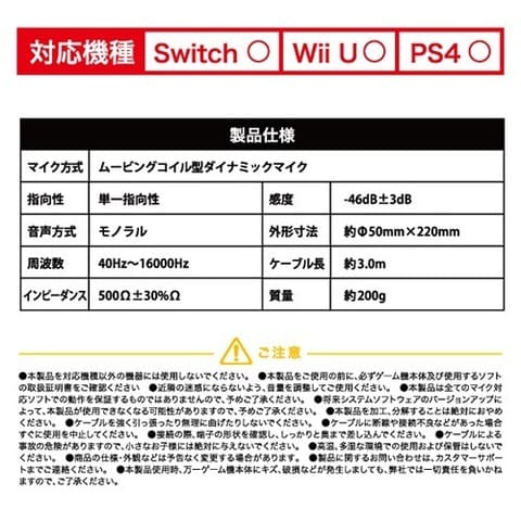 | ・対応機種:Switch・wiiU・PS4シリーズ ・マイク方式:ムービングコイル型ダイナミックマイク ・指向性:単一指向性 ・感度:-46dB±3dB ・音声方式:モノラル ・外形寸法:約Φ50mm*220mm ・周波数:40Hz~16000Hz ・ケーブル長:約3.0m ・インピーダンス:500Ω±30%Ω ・質量:約200g |