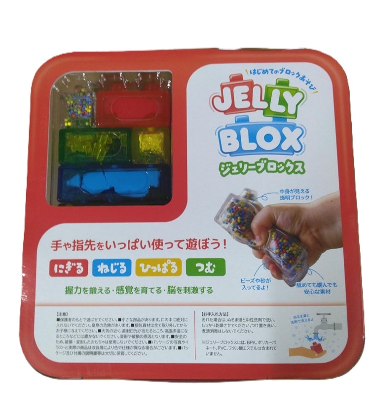 ●触ってびっくり!ジェリーブロックスは触感がぐにゃぐにゃとやわらかく、舐めても噛んでも安心なゴムの素材で作られています。