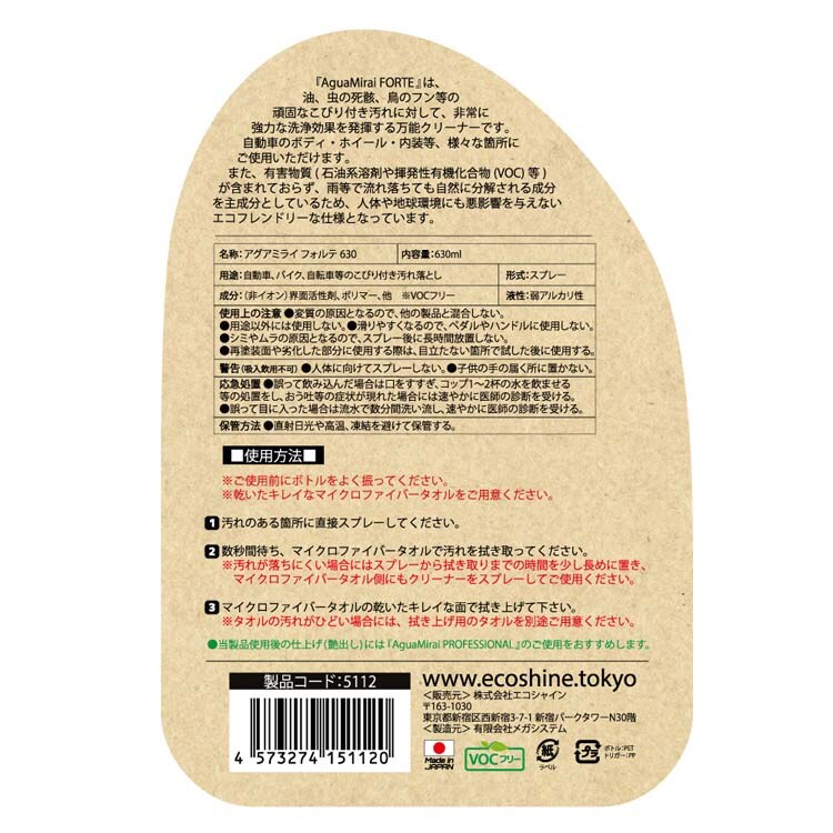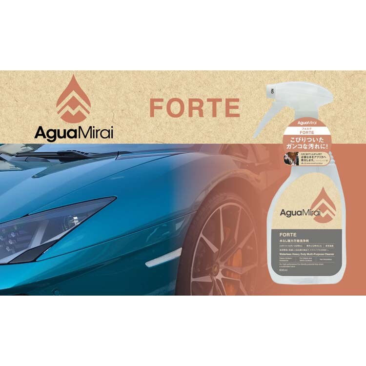 ●「AguaMirai FORTE」(アグアミライ フォルテ)は、虫の死骸、鳥のフン、油汚れ(ピッチ・タール)、ブレーキダスト等の頑固なこびり付き汚れに対し、洗浄効果を発揮する万能クリーナーです。