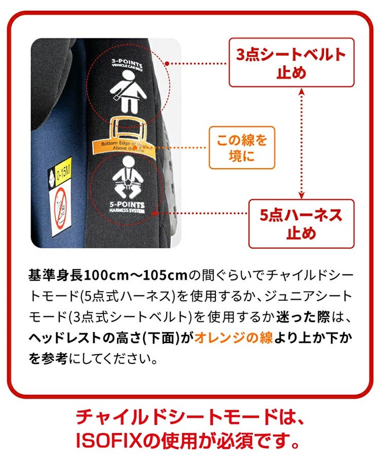 ●身長76cm(15ケ月以上)~150cm(12歳頃)までロングユースができるチャイルド&ジュニアシート。