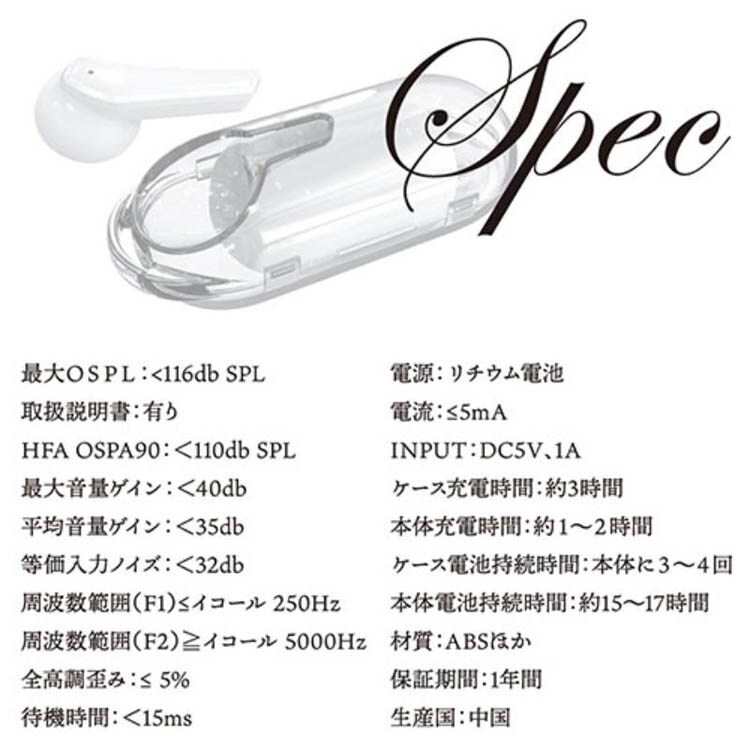 | 製品サイズ/重量:本体:19×15.5×34mm/4g×2個、充電ケース:83.5×34.2×31.5mm/26g 最大OSPL:116db SPL 取扱説明書:有り HFA OSPA90:110db SPL 最大音量ゲイン:40db 平均音量ゲイン:35db 等価入力ノイズ:32db 周波数範囲:F1:250Hz、F2:5000Hz 全高調歪み:~5% 待機時間:15ms 電源:リチウム電池 電流:~5mA INPUT:DC5V、1A 充電時間:充電ケース:約3時間、本体:約1~2時間 電池持続時間(目安):充電ケース:約、本体に3~4回、本体:約15~17時間DC3.7V(内蔵充電池使用) 材質:ABSほか 保証期間:1年間 生産国:中国 |