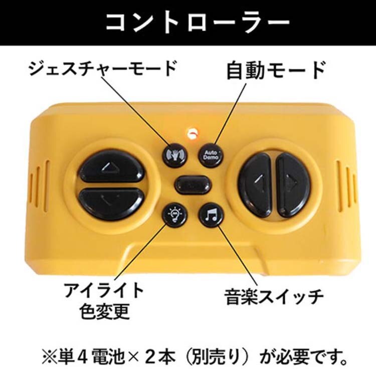 | ・サイズ(本体):約12×8.5×12cm ・重量(本体):約250g ・サイズ(リモコン):約120×35×65mm ・重量(リモコン):約37g ・材質(本体、リモコン):ABSほか ・電源(本体):単4乾電池×3本(別売り)/3.7V500mAh ・電源(リモコン):リチウム充電池/USB Type-C充電 ・充電時間:60分 ・リモコン操作時間:30~40分 ・機能:前進、後進、左右、3つのライトモード、センサーモード ・保証期間:3か月 ・生産国:中国 ・対象年齢:8歳以上 |