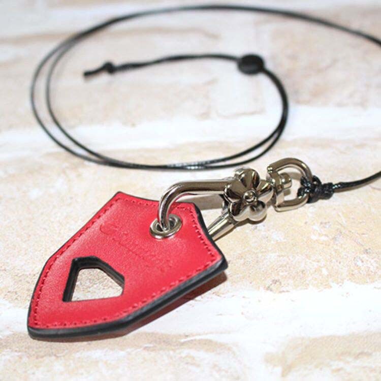 | ・素材:ペンダント:本革(牛革)、ストラップ:ポリエステル ※アジャスター:ゴム(首から下がる位置を調整出来るアジャスター付き) ・カラー:ペンダント:レッド、ペンダントのフチはブラック、ストラップ:ブラック、金具:シルバー ・サイズ:ペンダント部:縦幅53mm、横幅45mm、厚み3mm、開口部:横幅最大20mm ・重量:約18g |