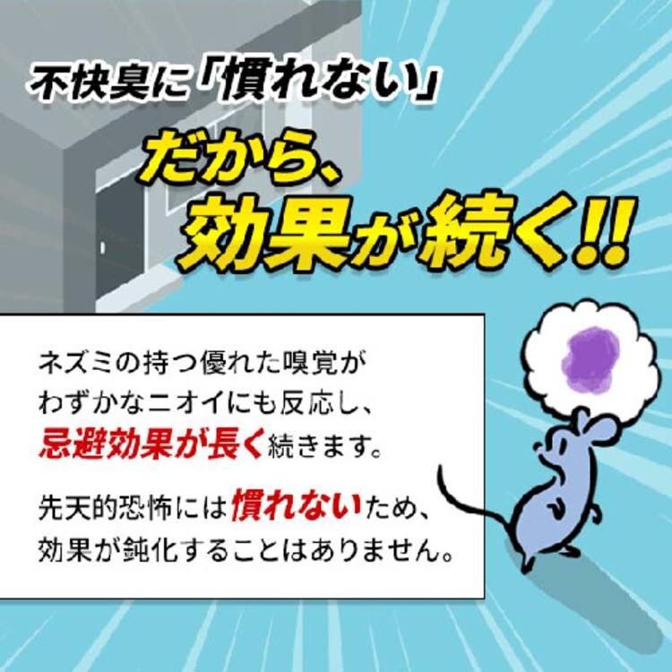 ●ネズミに対し先天的恐怖を引き起し、生存本能に作用します。殺傷することなくネズミの侵入を食い止めます。本能に作用するため慣れることはありません。