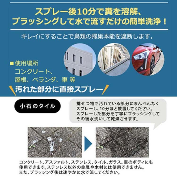 ●鳥類の排泄物を溶解、防臭機能を併せ持った洗浄剤です。