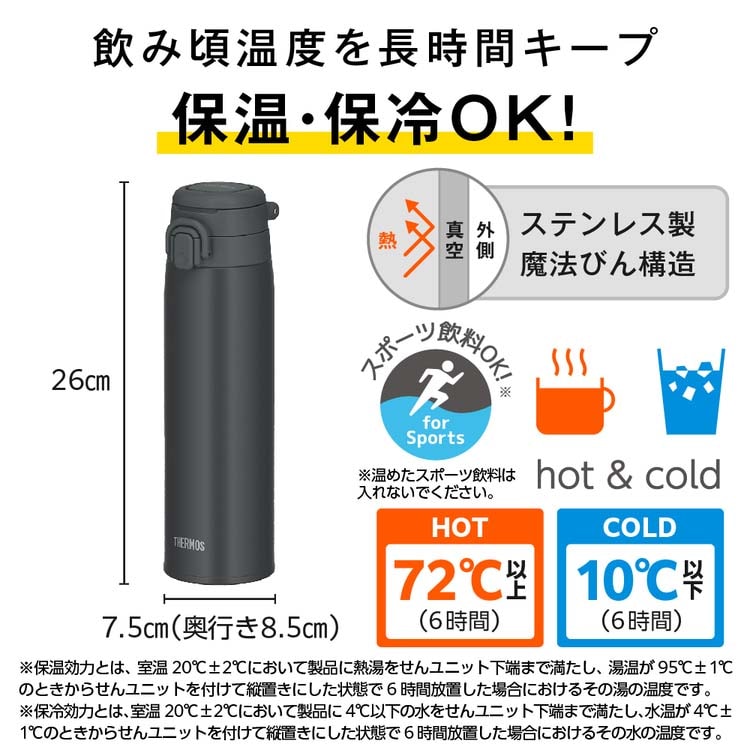 | 本体寸法:約幅7.5×奥行8.5×高さ26cm 本体重量:約0.3kg 実容量:0.75L 口径:約4.0cm 保温効力:72度以上(6時間) 保冷効力:10度以下(6時間) 材質:内びん:ステンレス鋼/胴部:ステンレス鋼(アクリル樹脂塗装)/ループ・フタ・せん本体・飲み口:ポリプロピレン/フタパッキン・せんパッキン:シリコーンゴム ※食洗機対応モデルとなります。 |