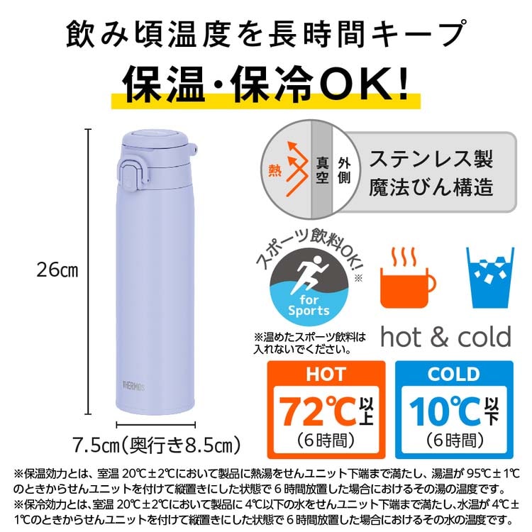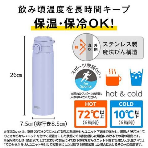 | 本体寸法:約幅7.5×奥行8.5×高さ26cm 本体重量:約0.3kg 実容量:0.75L 口径:約4.0cm 保温効力:72度以上(6時間) 保冷効力:10度以下(6時間) 材質:内びん:ステンレス鋼/胴部:ステンレス鋼(アクリル樹脂塗装)/ループ・フタ・せん本体・飲み口:ポリプロピレン/フタパッキン・せんパッキン:シリコーンゴム ※食洗機対応モデルとなります。 |