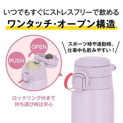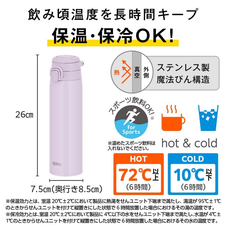 | 本体寸法:約幅7.5×奥行8.5×高さ26cm 本体重量:約0.3kg 実容量:0.75L 口径:約4.0cm 保温効力:72度以上(6時間) 保冷効力:10度以下(6時間) 材質:内びん:ステンレス鋼/胴部:ステンレス鋼(アクリル樹脂塗装)/ループ・フタ・せん本体・飲み口:ポリプロピレン/フタパッキン・せんパッキン:シリコーンゴム ※食洗機対応モデルとなります。 |