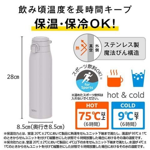 | 本体寸法:約幅8.5×奥行8.5×高さ28cm 本体重量:約0.4kg 実容量:1L 口径:約4.0cm 保温効力:75度以上(6時間) 保冷効力:9度以下(6時間) 材質:内びん:ステンレス鋼/胴部:ステンレス鋼(アクリル樹脂塗装)/ループ・フタ・せん本体・飲み口:ポリプロピレン/フタパッキン・せんパッキン:シリコーンゴム ※食洗機対応モデルとなります。 |