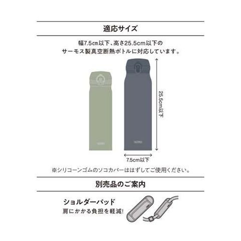 | 本体寸法(約):幅8.5×奥行8.5×高さ28cm 本体重量(約):100g 適応サイズ:約0.5~0.75Lサイズ 材質:外生地:ナイロン/内生地:PEVA/クッション(断熱材):発泡EVA |