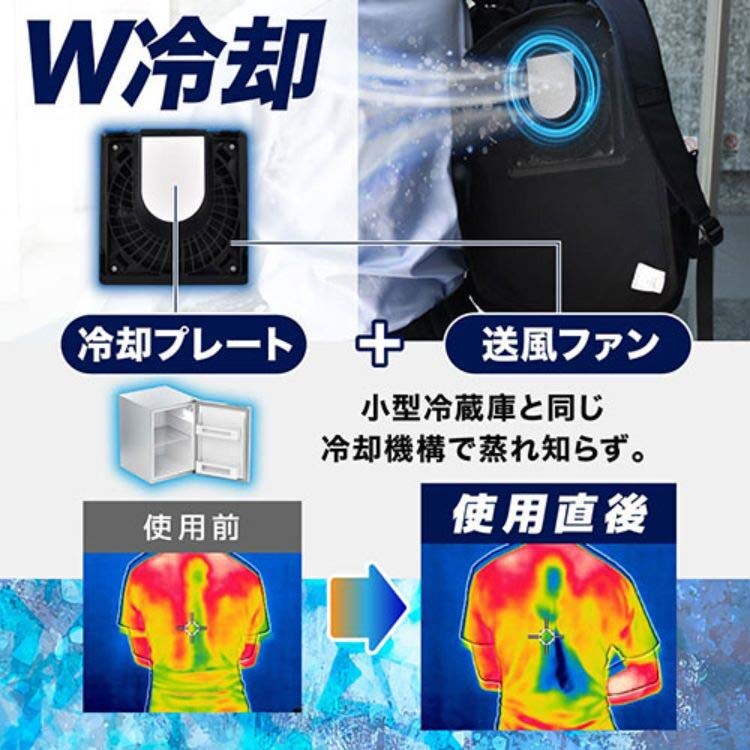 ●背中に直接冷却プレートが当たることで冷感を、送風ファンによって涼感を得られます。