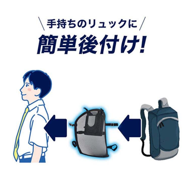 ●リュックの肩ベルトに固定し、冷却プレートをお好みの位置に調整するだけなので簡単に取り付けられます。
