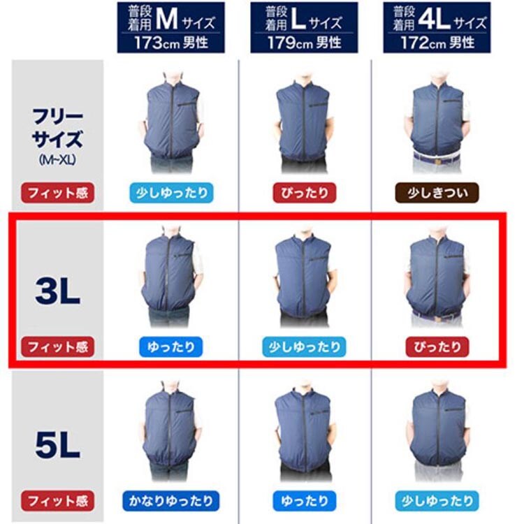 | ・サイズ:3Lサイズ…胸囲126×肩幅50×着丈70cm ・重量:約800g ・電源:USB(5V 2.0A以上) ・消費電力:約10W ・モード:強モード・弱モード/ペルチェON、OFF ・稼働時間(ファン+ペルチェ使用時):強…約2時間30分/弱…約3時間(モバイルバッテリー10000mAh使用時)※使用環境、モバイルバッテリーの性能により異なる。 ・冷却プレート温度:強…環境温度より-10~-15度/弱…環境温度より-5~-10度/ペルチェのみ…環境温度より-15~-19度 ※試験環境温度35度時 ・使用推奨環境温度:20~35度 ・ケーブル長:120mm(コントローラー~USBプラグ) ・材質:布…ポリエステル100%チタン加工/ユニット部…ABS/冷却プレート…アルミ ・セット内容:本体、日本語取扱説明書 ・パッケージサイズ:幅200×奥行280×高さ100(mm) ・パッケージ込み重量:約1kg ・保証期間:購入日より12ヶ月 ※仕様は改善のため予告無く変更する場合があります。 |