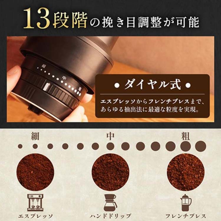 ●13段階の挽き目調整が可能なため、エスプレッソからフレンチプレスまで、さまざまな抽出方法に合わせた挽き方ができます。