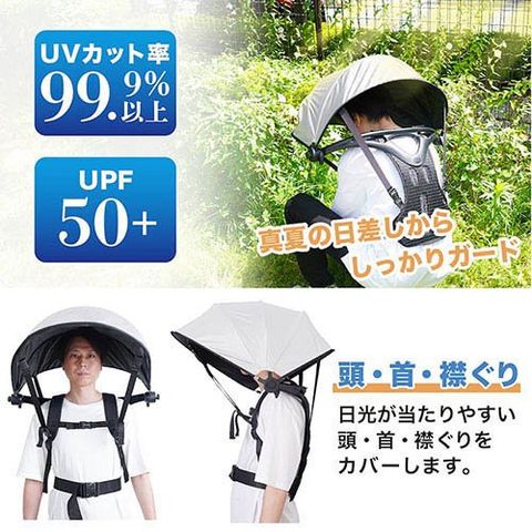 ・炎天下での作業時、強い日差しを防ぎたくても、日傘を差すと片手がふさがってしまったり、帽子だと日陰になる範囲が狭かったりと完全に日差しを防ぐのが難しい場合があります。