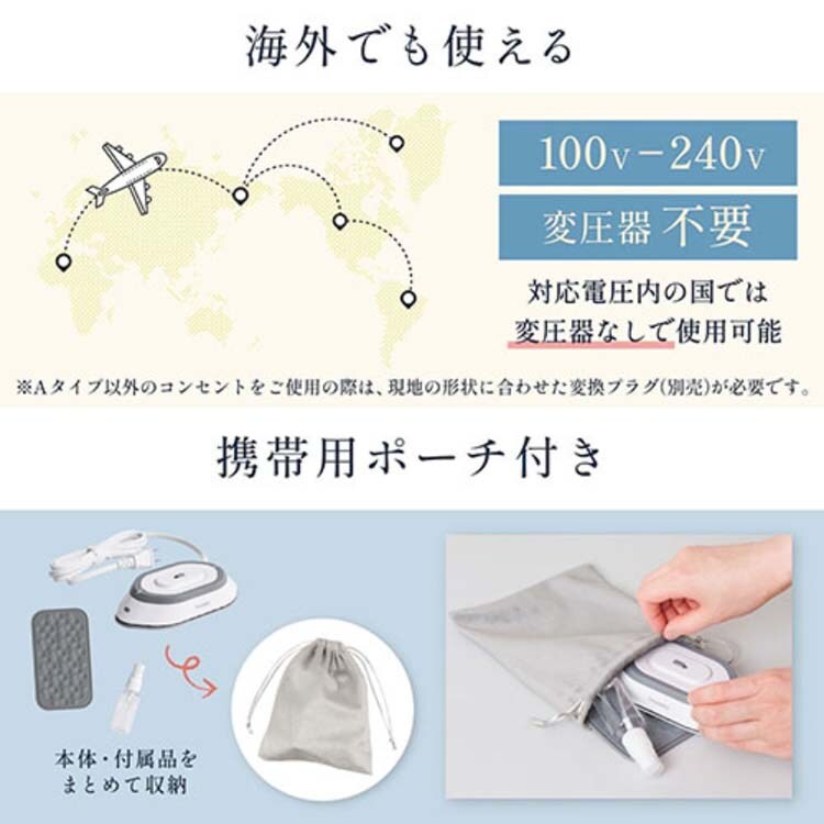 ※Aタイプ以外のコンセントをご使用の際は、現地の形に合わせた変換プラグ(別売)が必要です。また、持ち運びに便利な携帯用ポーチが付属しており、本体と付属品をまとめて持ち運べます。