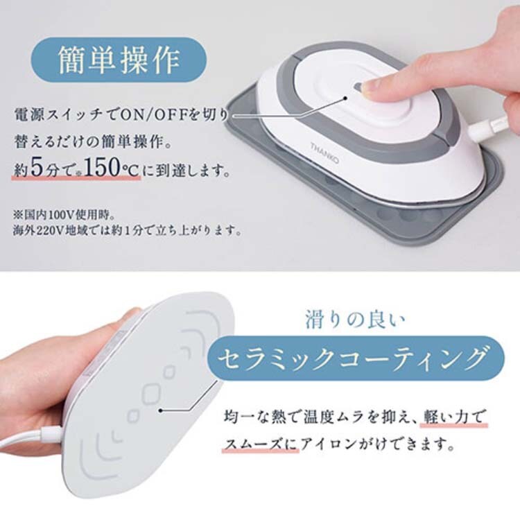 ●変圧器不要で海外でもそのまま使える、手のひらサイズのポータブルアイロンです。