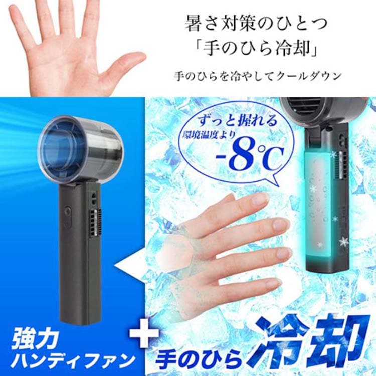 ●ファンで風をあびつつ、手のひら冷却をするハンディファンです。