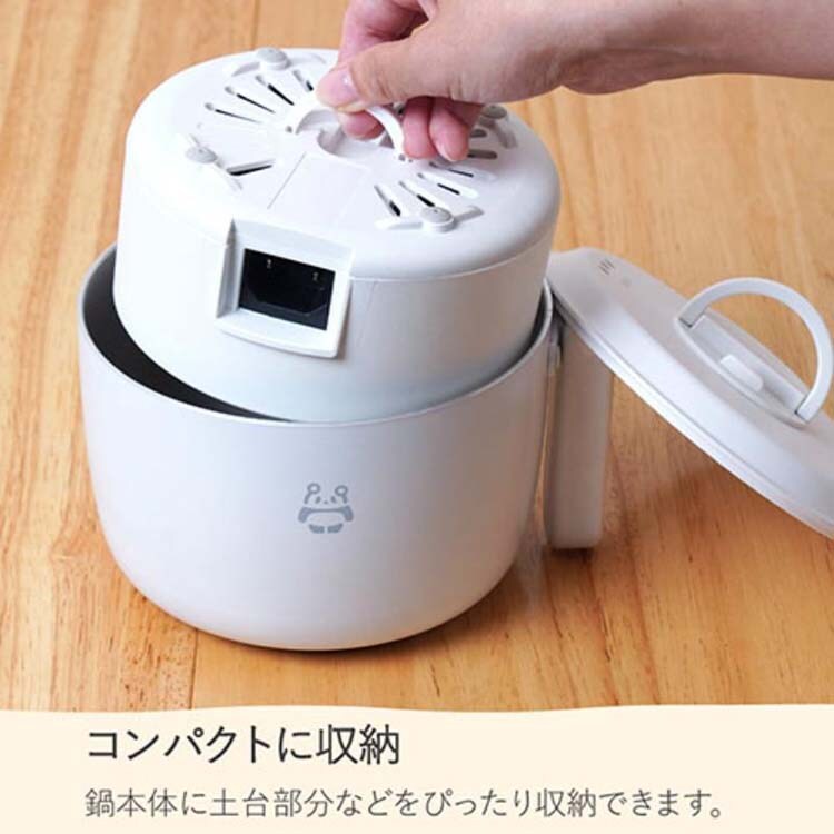 | ・サイズ:幅240×奥行150×高さ190mm ・重量:約880g ・電源:AC100V 50/60Hz ・消費電力:600W ・コード長:約100mm ・材質:鍋・・・アルミ、ふた・・・PET、土台・・・アルミ・PET ・パッケージサイズ:幅190×奥行190×高さ174mm ・パッケージ込み重量:約1.1kg ・保証期間:購入日より12ヶ月 |