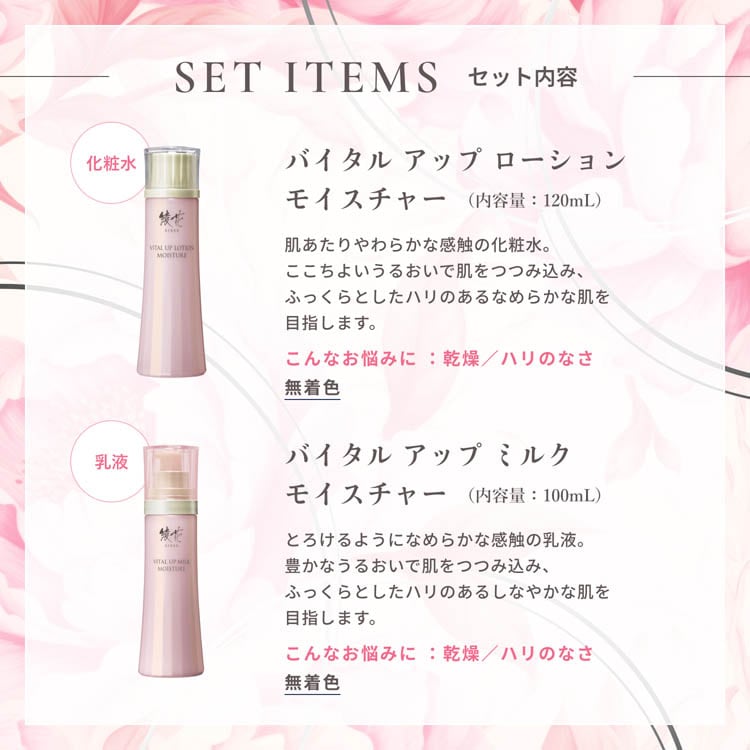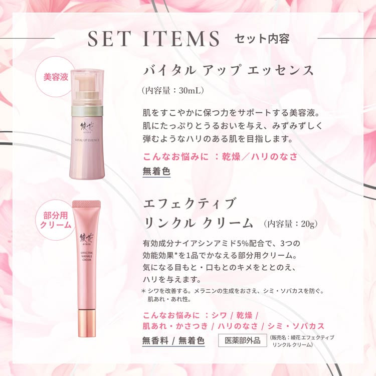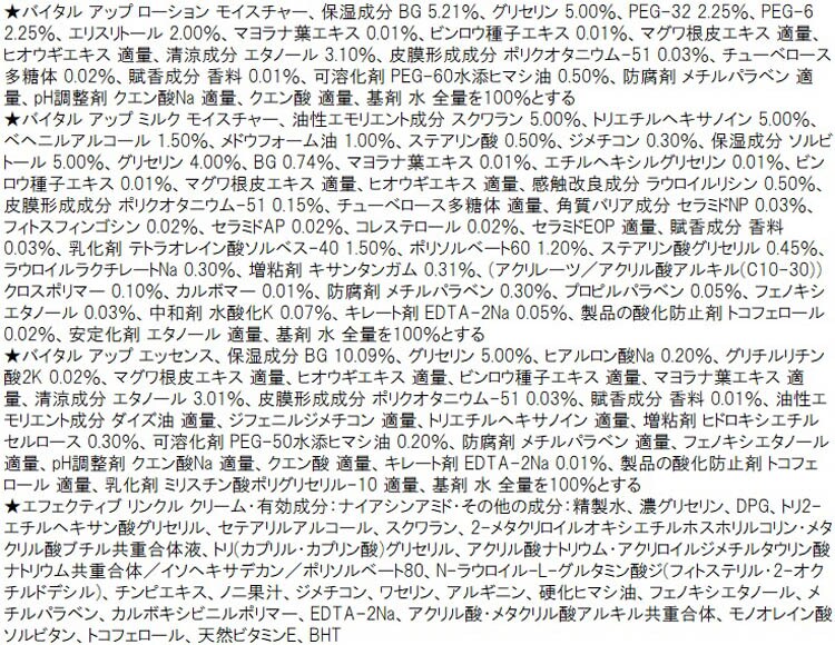 | ・バイタル アップ ローション モイスチャー 120mL ・バイタル アップ ミルク モイスチャー 100mL ・バイタル アップ エッセンス 30mL ・エフェクティブ リンクル クリーム 20g |