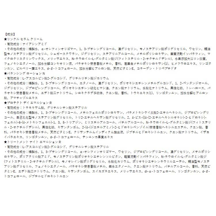 | ・リンクル セラム クリーム 30g ・バランシング ローション N(化粧水)30mL ・プロテクト デイ エマルション R(日中用乳液)10mL ・トリートメント ナイト エマルション R(夜用乳液)10mL |