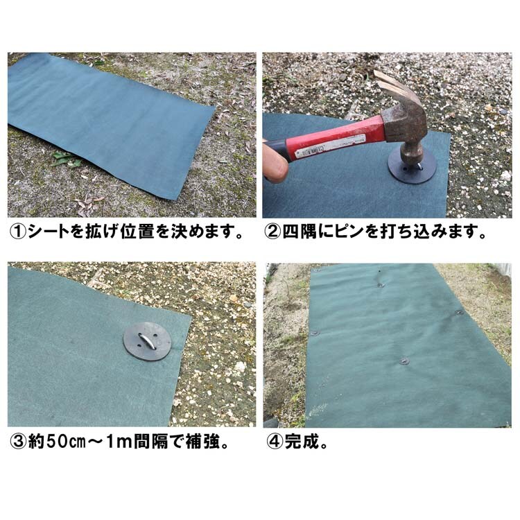 ・小さな雑草の場合、施工前の除草は不要です。シートは空気を通しますので、樹木の周囲に開口部を作る必要はありません。状況に応じてピンの種類・本数をを変えてください。
