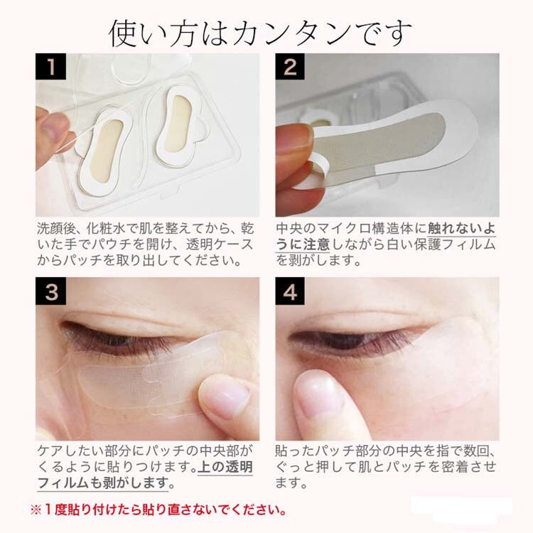 ・洗顔後、化粧水で肌を整えたあと、パッチを取り出し、 目元か口元の左右に1枚ずつ密着するように貼り、そのままお休みください。