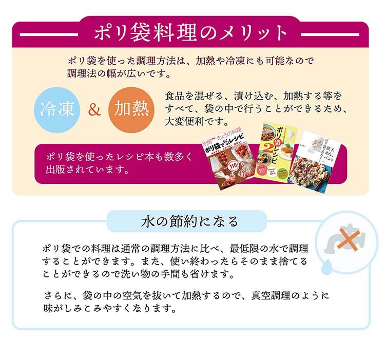 ●混ぜたり漬け込んだりの下ごしらえから、冷蔵・冷凍などの保存、湯煎での加熱調理まで袋の中でできるので大変便利です。