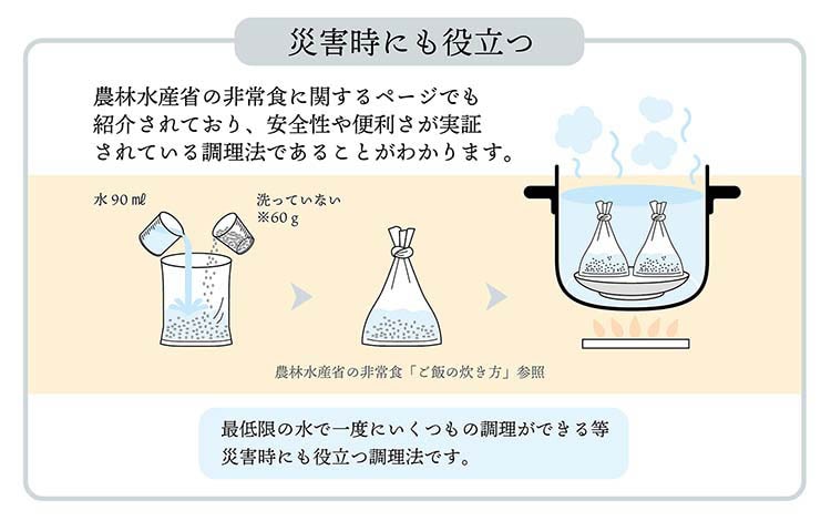 ●少ない水で調理できるので節水にもなり、お米も炊くことができるので防災グッズとしてもおすすめです。