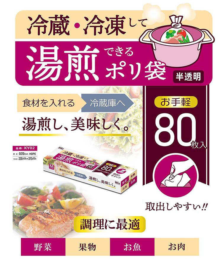 ●食材を入れて、冷蔵・冷凍保存をして、そのまま湯煎ができるポリ袋です。