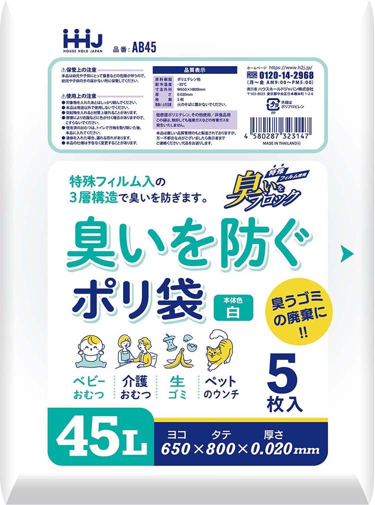 ゴミ袋 臭いを防ぐ ポリ袋 45L 白 AB45 (5枚入×4セット)