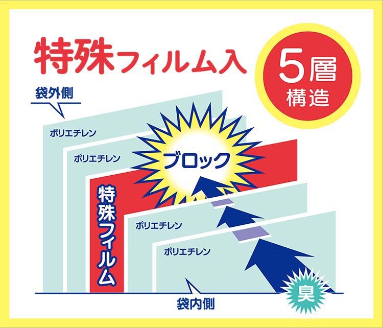 ●特殊フィルムを使用した5層構造で臭いを防ぎます。
