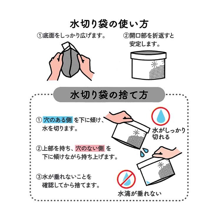 ●半分だけ穴をあけているので、穴がない側に袋を傾ければ水が垂れにくく、捨てる時のストレス軽減してくれます。