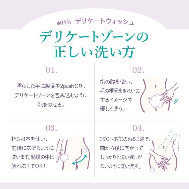 ●デリケートウォッシュはデリケートゾーンと同じ弱酸性、更にアルコール・パラベンフリー。落としすぎによる乾燥を防ぎ、ひりつきを起こしにくい処方です。