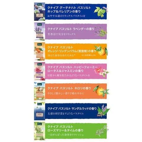 クナイプ グーテナハト バスソルト ホップ&バレリアンの香り、クナイプ バスソルト ラベンダーの香り、クナイプ バスソルト オレンジ・リンデンバウム<菩提樹>の香り、クナイプ バスソルト ハッピーフォーミー ロータス&ジャスミンの香り、クナイプ バスソルト ネロリの香り、クナイプ バスソルト サンダルウッドの香り、クナイプ バスソルト ローズマリー&タイムの香り